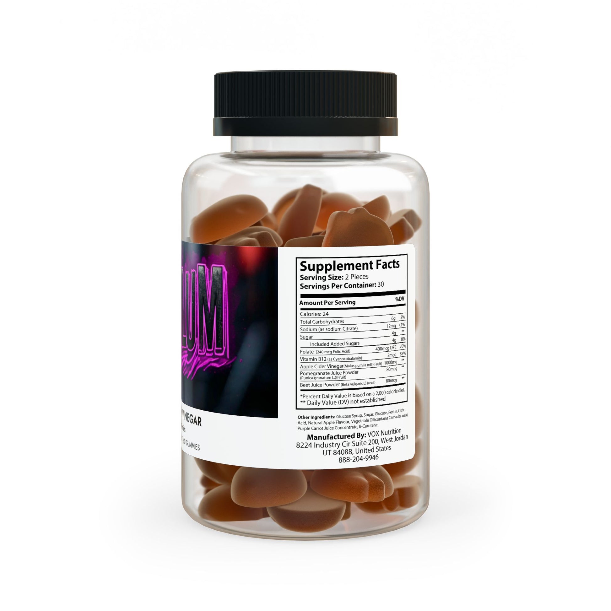 Key ingredients include Sodium (as Sodium Citrate), Sugar, Folate (240 mcg Folic Acid), Vitamin B12 (as Cyanocobalamin), Apple Cider Vinegar (Malus pumila mill)(Fruit), Pomegranate Juice Powder (Punica granatum) (Fruit), and Beet Juice Powder (Beta vulgaris) (root).
